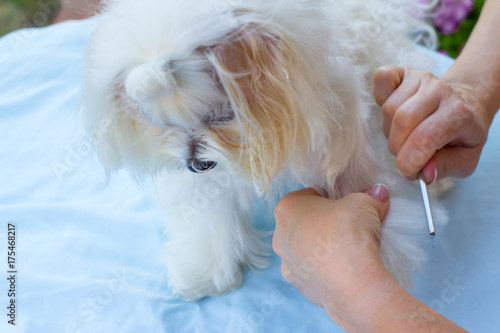 Grooming Dog With Tool For Shedding Hair Medicine Pet Animals https://stock.adobe.com/sk/images/grooming-dog-with-tool-for-shedding-hair-medicine-pet-animals-health-care-and-people-concept-scissors-work-miniature-maltese-stands-still-while-its-hair-is-being-cut/175468217